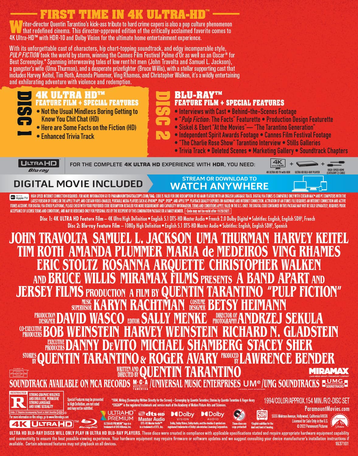 Writer/director Quentin Tarantino's highly stylized, Oscar-winning salute to old-time crime novels flips back and forth in time to interweave tales of temptation, violence, and redemption. The tangled roster of characters includes hit man odd couple Vincent and Jules (John Travolta, Samuel L. Jackson), coke-sniffing mobster's wife Mia (Uma Thurman), and crooked boxer Butch (Bruce Willis). With Harvey Keitel, Ving Rhames, Maria de Medeiros, Tim Roth, Amanda Plummer, Christopher Walken. 154 min. Widescreen; Soundtrack: English. Two-disc set.