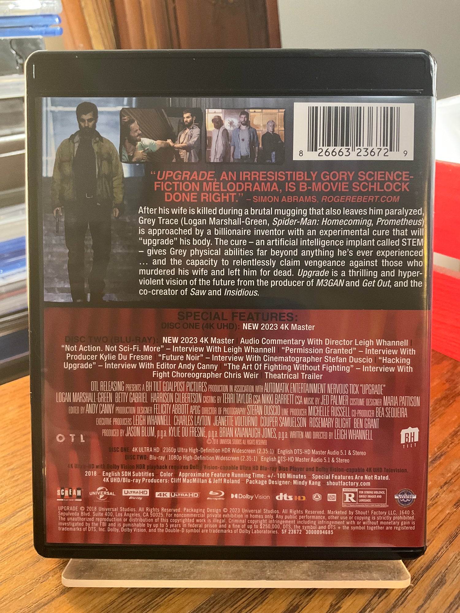 After his wife is killed during a brutal mugging that also leaves him paralyzed, Grey Trace (Logan Marshall-Green, Spider-Man: Homecoming, Prometheus) is approached by a billionaire inventor with an experimental cure that will "upgrade" his body. The cure – an artificial intelligence implant called STEM – gives Grey physical abilities far beyond anything he's ever experienced ... and the capacity to relentlessly claim vengeance against those who murdered his wife and left him for dead. Upgrade is a thrilling and hyper-violent vision of the future from the producer of M3GAN and Get Out, and the co-creator of Saw and Insidious.