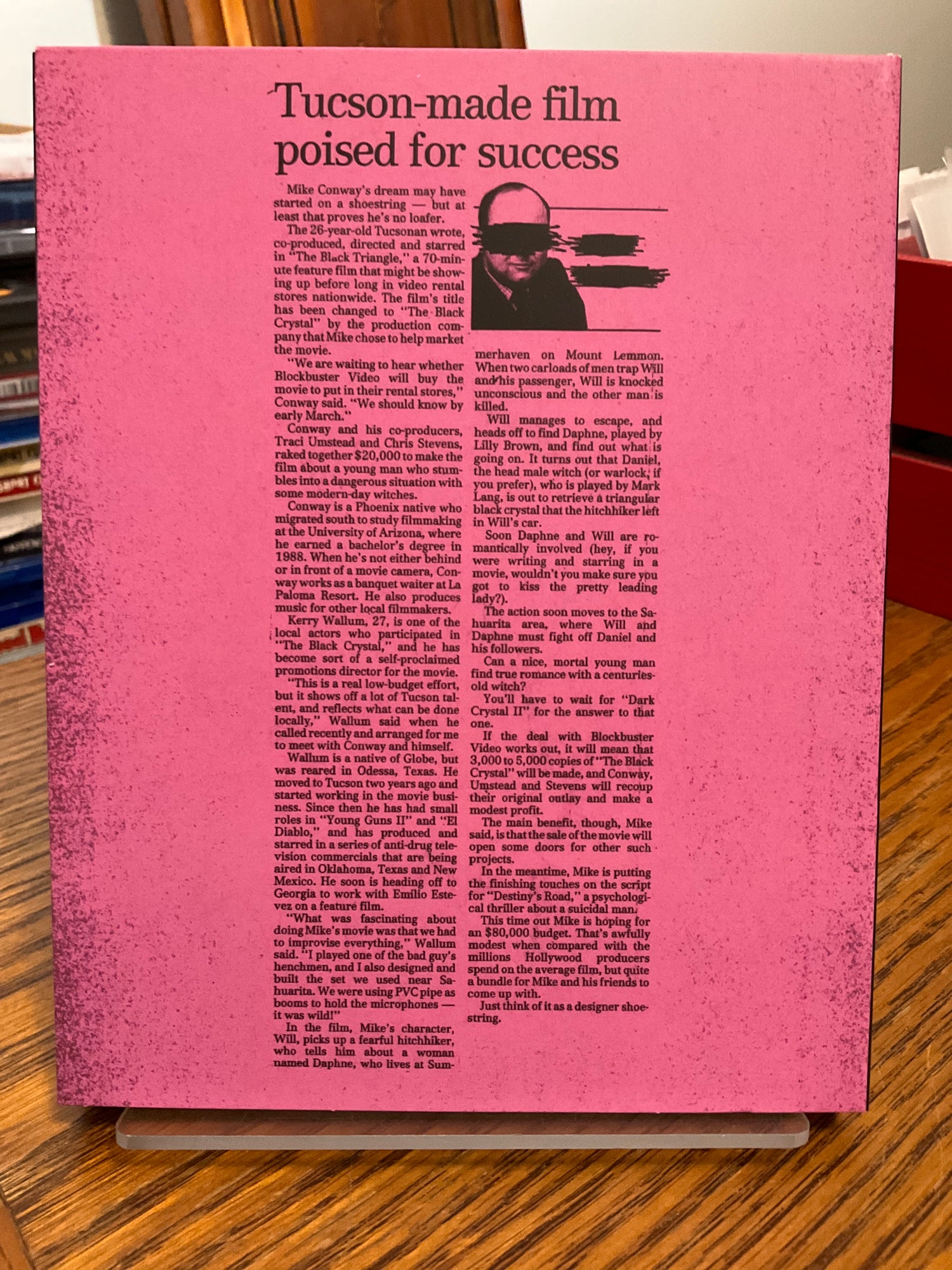 Inspired by the Matamoras cult murders and shot entirely on Super 8, THE BLACK CRYSTAL is an action-horror hallucination that was filmed in the backwoods of Tucson, Arizona. The story follows Will (writer-director-producer-editor-composer Mike Conway) as he and his yellow Trans Am encounter a gang of Satanic cultists led by the evil Daniel. Surviving the ordeal, Will meets up with Daphne, a goth witch with a "power channeler" called the Black Crystal that might hold the key to the underworld. Awash with kickboxing dads, dollar store bloodshed, and a killer synthesizer score, this is an imaginative and ambitious homemade funbomb that has been missing in action since it's original VHS release. AGFA presents THE BLACK CRYSTAL on disc for the first time ever, featuring a new preservation from the original 3/4" tape master and enough extras to fill Daniel's Satanic shed.