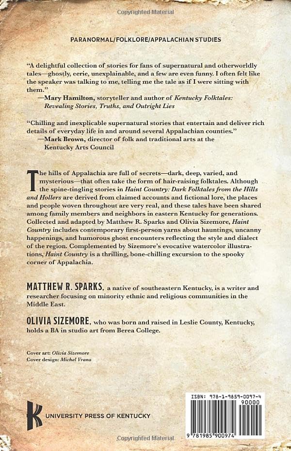 Haint Country: Dark Folktales from the Hills and Hollers is a collection of weird, otherworldly, and mystic phenomena―tales that have been recorded and documented for the first time. Collected and adapted by Matthew R. Sparks and Olivia Sizemore, the anthology explores ghosts or "haints," strange creatures or "boogers," haunted locations or "stained earth," uncanny happenings or "high strangeness," and humorous Appalachian ghost encounters. Contemporary first-person yarns about black panthers, demons, and spectral coal miners reflect the style and dialect of the region. Though comprised of a mixture of claimed accounts and fictional lore, the locations and people woven throughout are very real.