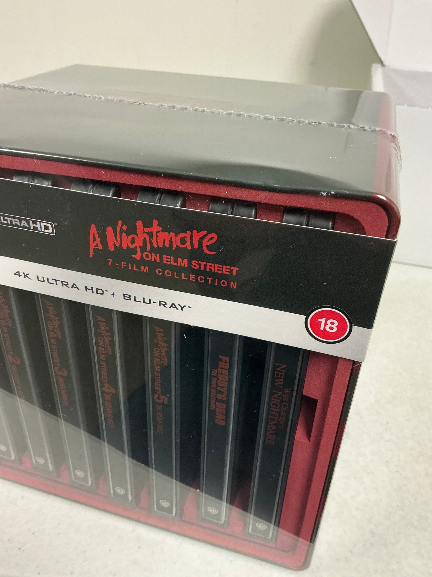 A brand new Steelbook collection featuring Wes Craven's 'A Nightmare on Elm Street' series. Featuring the films on 4K UHD and Blu-Ray, 7 Steelbooks and steel outer-case all with brand new artwork.