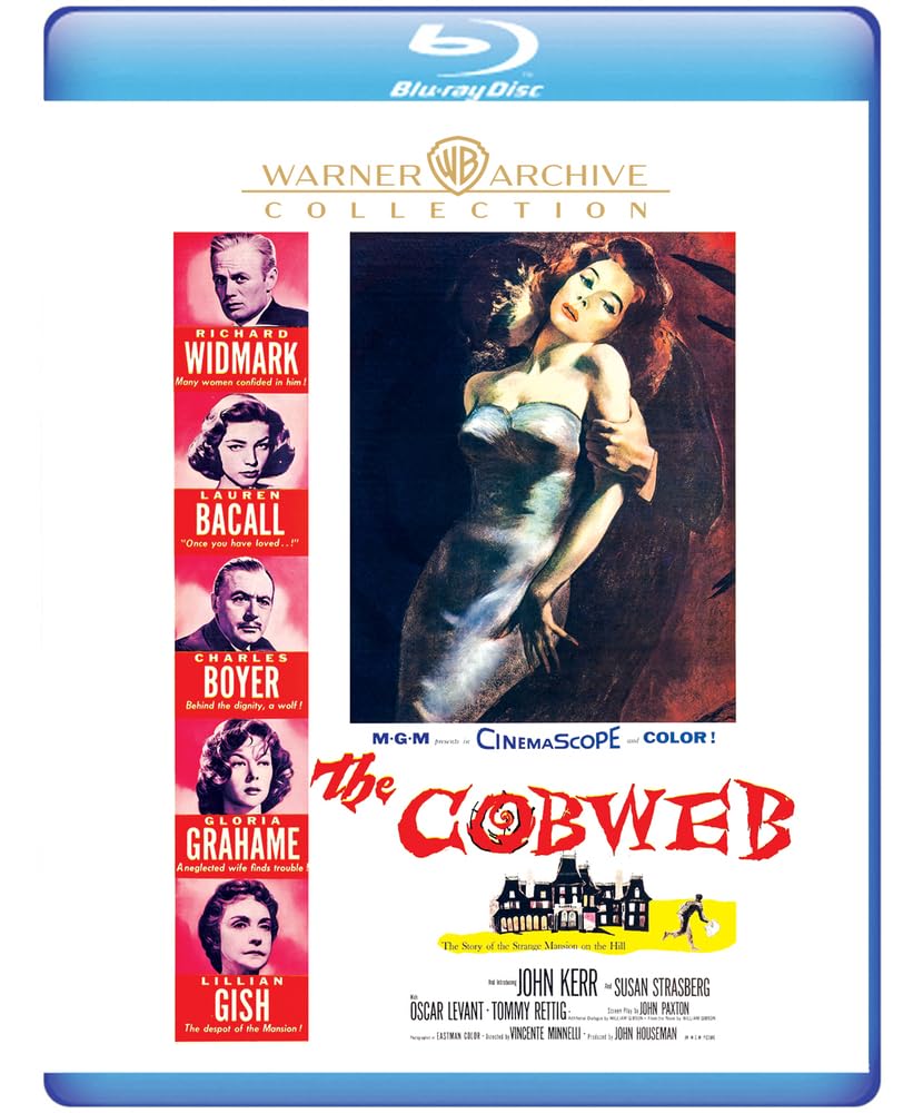 Step inside the Castle, a large private psychiatric facility. Here, Dr. Stewart McIver (Richard Widmark) devotes night and day to his profession while neglecting his pining, voluptuous wife (Gloria Grahame). A colleague (Charles Boyer) with a fondness for booze and a pretty face seeks to comfort the wife. Now add Lauren Bacall, Lillian Gish, John Kerr, Susan Strasberg, Oscar Levant and subplots of love, life and derangement and you have the entanglements of The Cobweb. Some critics gleefully skewered the film's labored storyline about patient involvement in the choice of library draperies, but pay no heed. With it's top cast and Vincente Minnelli's command of color and melodrama, this film is popcorn for fans of soaps.