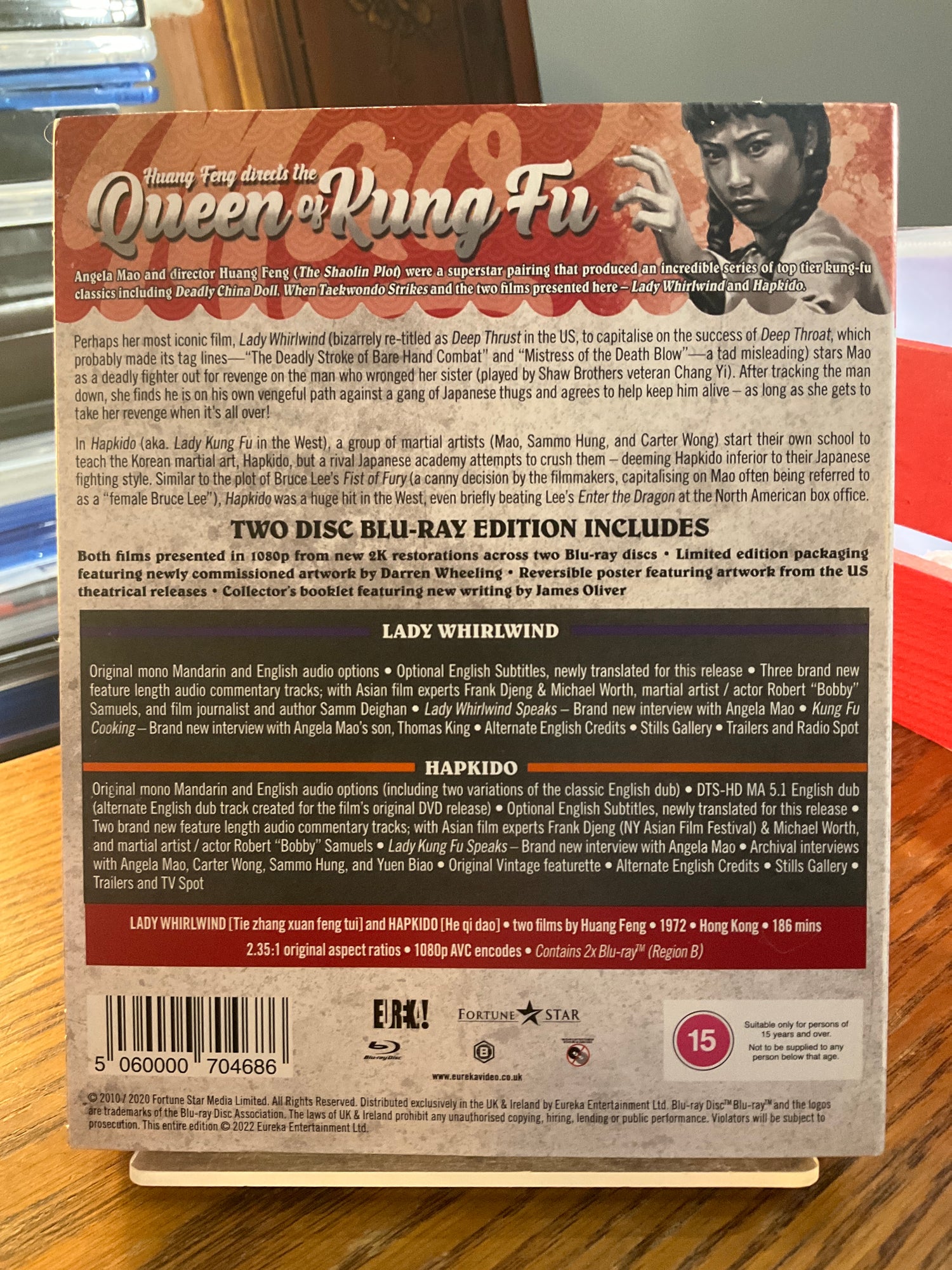 Description: Angela Mao and director Huang Feng (The Shaolin Plot) were a superstar pairing that produced an incredible series of top tier kung-fu classics including Deadly China Doll, When Taekwondo Strikes and the two films presented here - Hapkido and Lady Whirlwind. In Hapkido (aka. Lady Kung Fu in the West), a group of martial artists (Mao, Sammo Hung, and Carter Wong) start their own school to teach the Korean martial art, Hapkido, but a rival Japanese academy attempts to crush them - deeming Hapkido inferior to their Japanese fighting style. Similar to the plot of Bruce Lee's Fist of Fury (a canny decision by the filmmakers, capitalising on Mao often being referred to as a "female Bruce Lee"), Hapkido was a huge hit in the West, even briefly beating Lee's Enter the Dragon at the North American box office. Perhaps her most iconic film, Lady Whirlwind (bizarrely re-titled as Deep Thrust in the US, to capitalise on the success of Deep Throat, which probably made its tag lines - "The Deadly Stroke of Bare Hand Combat" and "Mistress of the Death Blow" - a tad misleading) stars Mao as a deadly fighter out for revenge on the man who wronged her sister (played by Shaw Brothers veteran Chang Yi). After tracking the man down, she finds he is on his own vengeful path against a gang of Japanese thugs and agrees to help keep him alive - as long as she gets to take her revenge when it's all over!