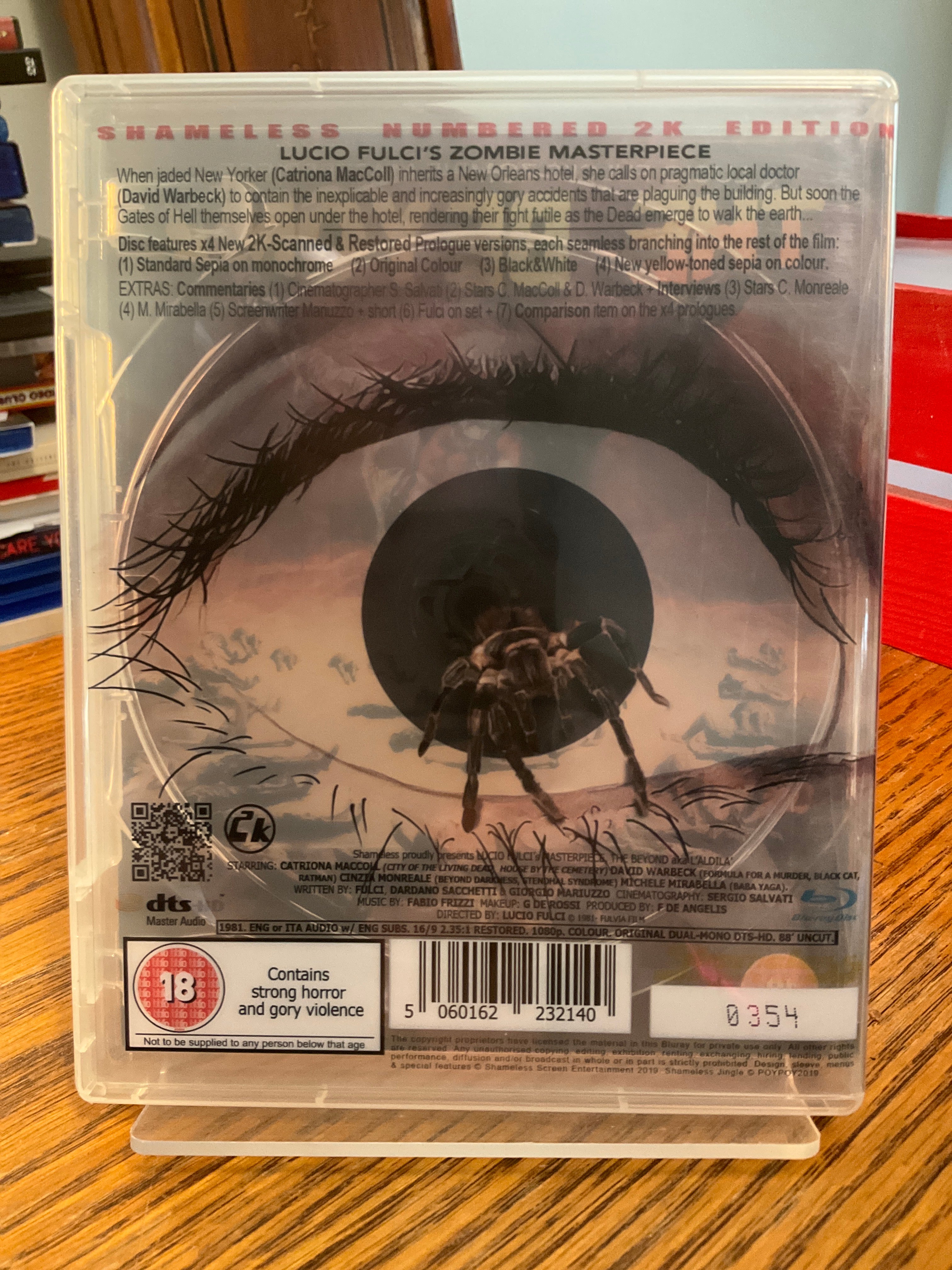 EXTRAS: Interviews with Cinzia Monreale, Michele Mirabella and Giorgio Mariuzzo, The Beyond prologue four-way comparison, Sergio Salvati audio commentary, Catriona McCall and David Warbeck audio commentary, Lucio Fulci banter on set.