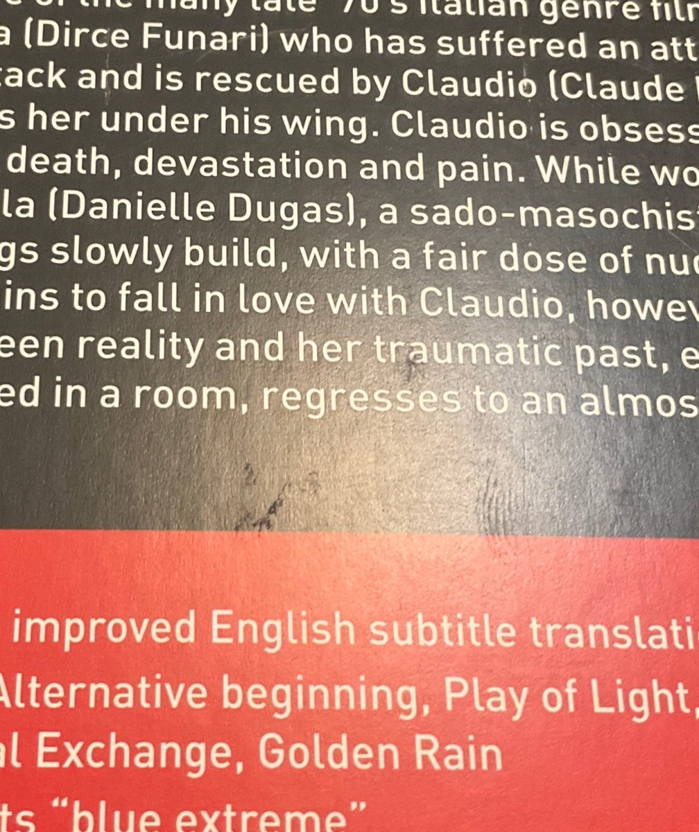 Touching upon art, trauma, madness and sexual perversion BLUE MOVIE is one of the most obscure of the many late 70s Italian genre films, the film centers around Silvia (Dirce Funari) who has suffered an attempted rape. She escapes the attack and is rescued by Claudio (Claude Maran), a photographer who takes her under his wing. Claudio is obsessed by war images that tell of death, devastation and pain. While working with a supermodel, Daniela (Danielle Dugas), it appears that their relationship is bordering sado-masochistic. Things slowly build, with a fair dose of nudity and perversion. Observing all this as best she can Silvia begins to fall in love with Claudio, however she struggles to discern between reality and her traumatic past, especially while Daniela, who is locked in a room, regresses to an almost bestial dimension.