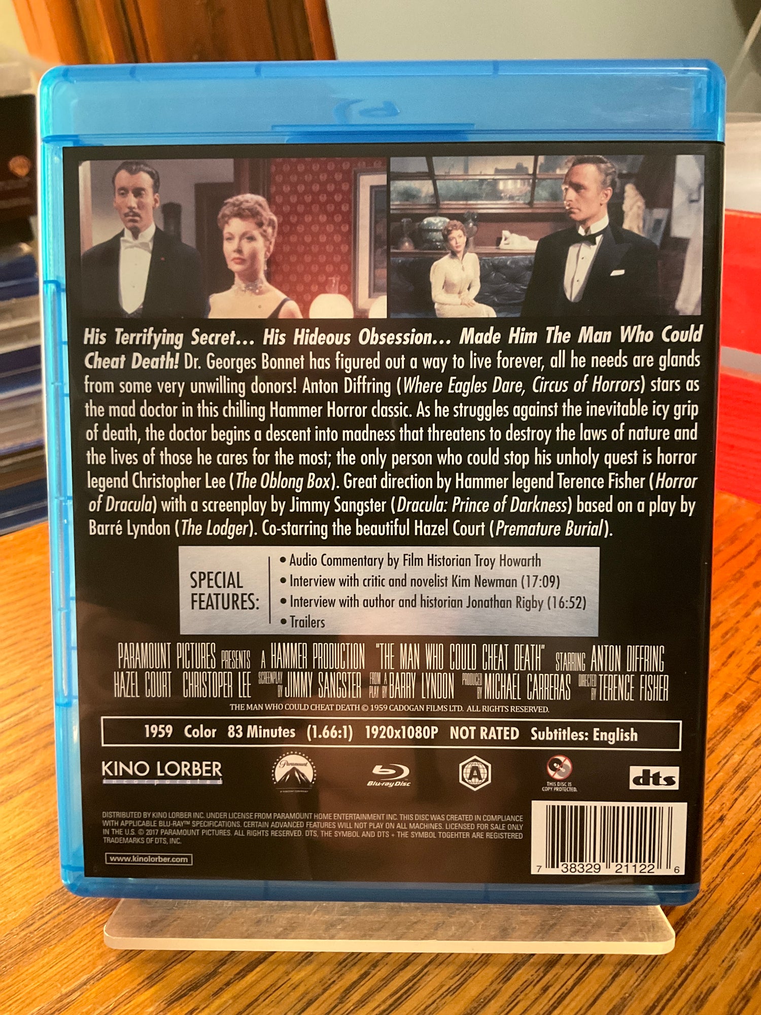 His Terrifying Secret… His Hideous Obsession… Made Him The Man Who Could Cheat Death! Dr. Georges Bonnet has figured out a way to live forever, all he needs are glands from some very unwilling donors! Anton Diffring (Where Eagles Dare, Circus of Horrors) stars as the mad doctor in this chilling Hammer Horror classic. As he struggles against the inevitable icy grip of death, the doctor begins a descent into madness that threatens to destroy the laws of nature and the lives of those he cares for the most; the only person who could stop his unholy quest is horror legend Christopher Lee (The Oblong Box). Great direction by Hammer legend Terence Fisher (Horror of Dracula) with a screenplay by Jimmy Sangster (Dracula: Prince of Darkness) based on a play by Barré Lyndon (The Lodger). Co-starring the beautiful Hazel Court (Premature Burial).