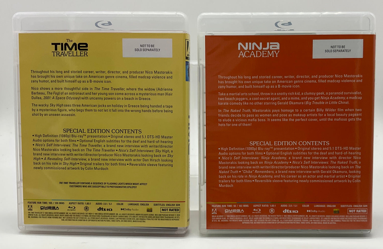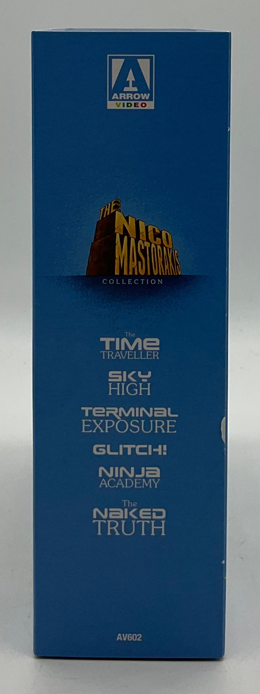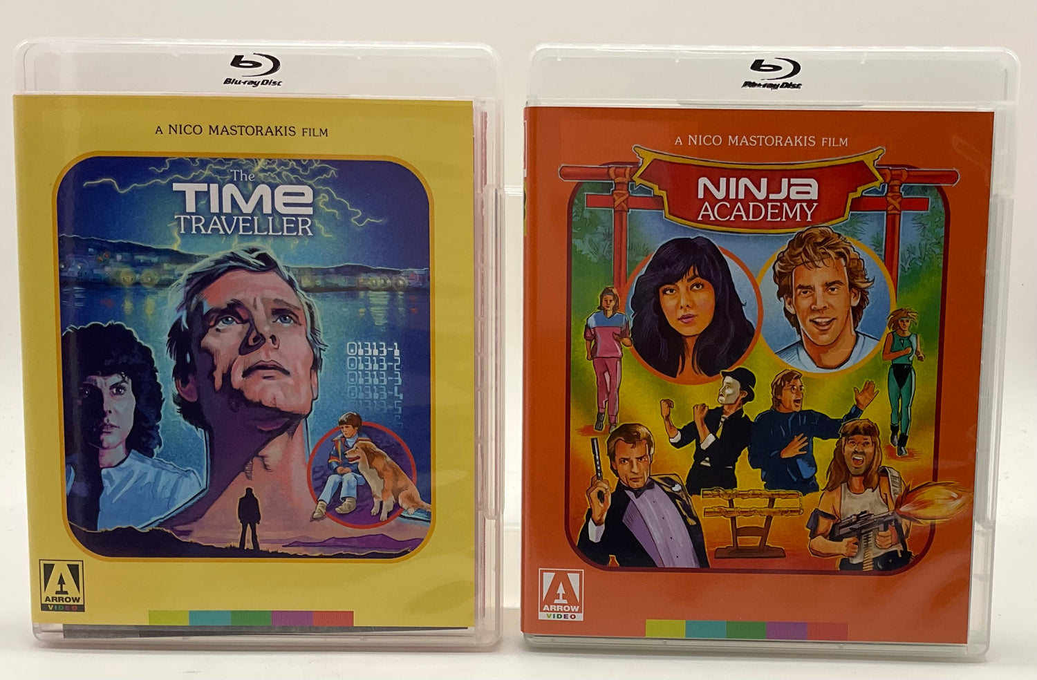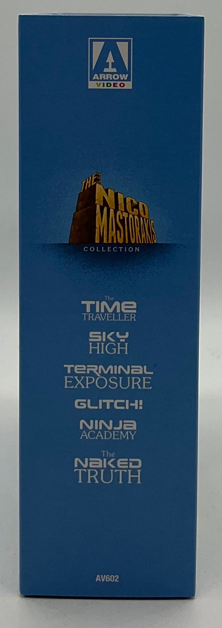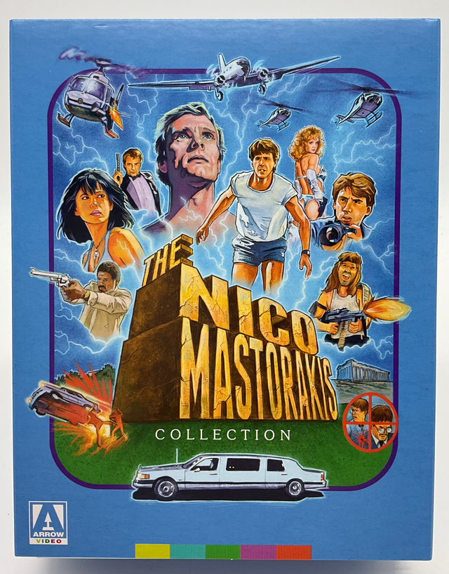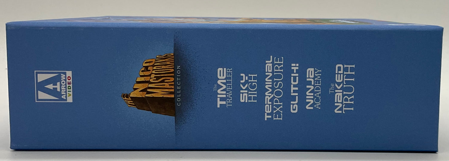 He's back! One of the most infamous B-movie maestros to have ever sat in a director's chair, Nico Mastorakis returns to Arrow Video with a collection of sci-fi shenanigans and screwball comedies that will take you out of this world! First up, Nico then shows a more thoughtful side in The Time Traveller, where the widow (Adrienne Barbeau, The Fog) of an astronaut and her young son come across a mysterious man (Keir Dullea, 2001: A Space Odyssey) with uncanny powers on a beach in Greece. The wacky Sky High sees three American jocks on holiday in Greece being handed a tape by a mysterious figure, who begs them to not let it fall into the wrong hands before being shot by an unseen assassin. Featuring an early score from the great Hans Zimmer, Terminal Exposure focuses on two carefree beach photographers, who accidentally photograph a murder and immediately set after the assassin: a tall, gorgeous blonde with a rose tattoo on her behind. Glitch! sees two bumbling burglars whose attempt to throw the house party of the century in the luxury home of a Hollywood producer is foiled by a group of mobsters determined to collect what the producer owes them - no matter what. Take a martial arts school, throw in a snotty rich kid, a clumsy geek, a paranoid survivalist, two beach joggers, a cool secret agent and a mime, and you get Ninja Academy, a madcap karate comedy like no other starring Gerald Okamura (Big Trouble in Little China). Finally, in The Naked Truth, Mastorakis pays homage to a certain Billy Wilder film when two friends decide to pass as women and pose as makeup artists for a local beauty pageant to elude a vicious mafia boss. It seems like the perfect cover, until the mafioso gets the hots for one of them! Zany, shocking and unhinged, Nico Mastorakis offers a satirical and sardonic skewering of American cinema with a chutzpah that must be seen to be believed!