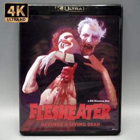 A lo-fi gore epic directed by actor and cinematographer Bill Hinzman (The Crazies), star zombie in the classic Night of the Living Dead, FLESHEATER (aka Revenge of the Living Dead) is a fitting tribute and homage to Romero’s chilling masterpiece, updating the setting to the late 1980s while piling on the gut munching, throat ripping, and limb tearing action. Vinegar Syndrome is delighted to bring this highly ambitious slice of regional madness to 4K UHD and Blu-ray, in a brand new, eye popping (and gouging) restoration from its original 16mm camera negative, presented in its cinematographer and producer approved 1.33:1 aspect ratio for the first time on disc, along with a host of brand new extra features!