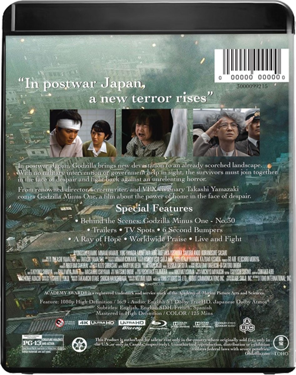 In postwar Japan, Godzilla brings new devastation to an already scorched landscape. With no military intervention or government help in sight, the survivors must join together in the face of despair and fight back against an unrelenting horror. From renowned director, screenwriter & VFX visionary Takashi Yamazaki (The Eternal Zero, Stand By Me Doraemon) comes Godzilla Minus One, a film about the power of home in the face of despair. The film stars Ryunosuke Kamiki, Minami Hamabe, Yuki Yamada, Munetaka Aoki, Hidetaka Yoshioka, Sakura Ando, and Kuranosuke Sasaki, with music by Naoki Sato.