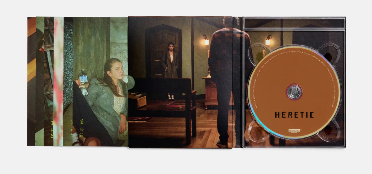 Special 4K UHD edition of Heretic, starring Hugh Grant, Sophie Thatcher, and Chloe East, and featuring A24-exclusive cover artwork.