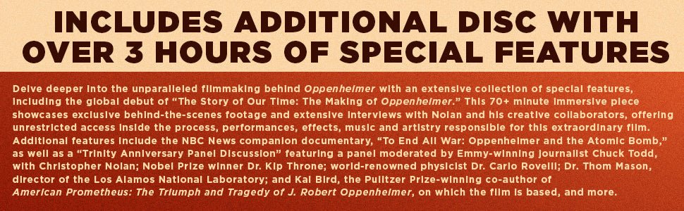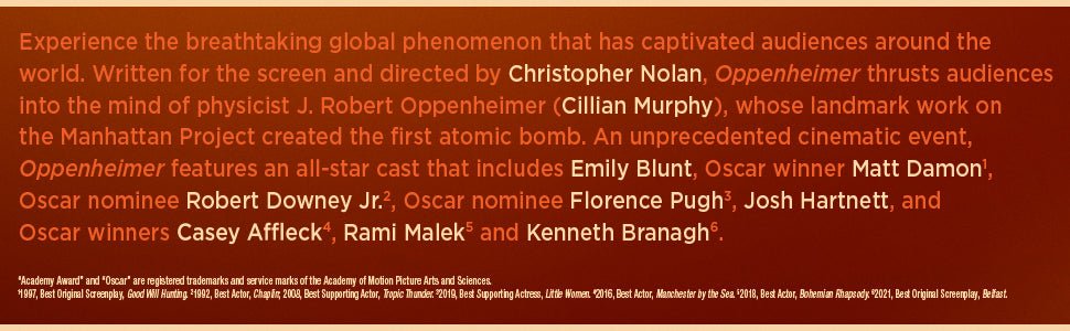 Experience the breathtaking global phenomenon that has captivated audiences around the world. Written for the screen and directed by Christopher Nolan, Oppenheimer thrusts audiences into the mind of physicist J. Robert Oppenheimer (Cillian Murphy), whose landmark work on the Manhattan Project created the first atomic bomb. An unprecedented cinematic event, Oppenheimer features an all-star cast that includes Emily Blunt, Oscar winner Matt Damon, Oscar nominee Robert Downey Jr., Oscar nominee Florence Pugh, Josh Hartnett, and Oscar winners Casey Affleck, Rami Malek and Kenneth Branagh.