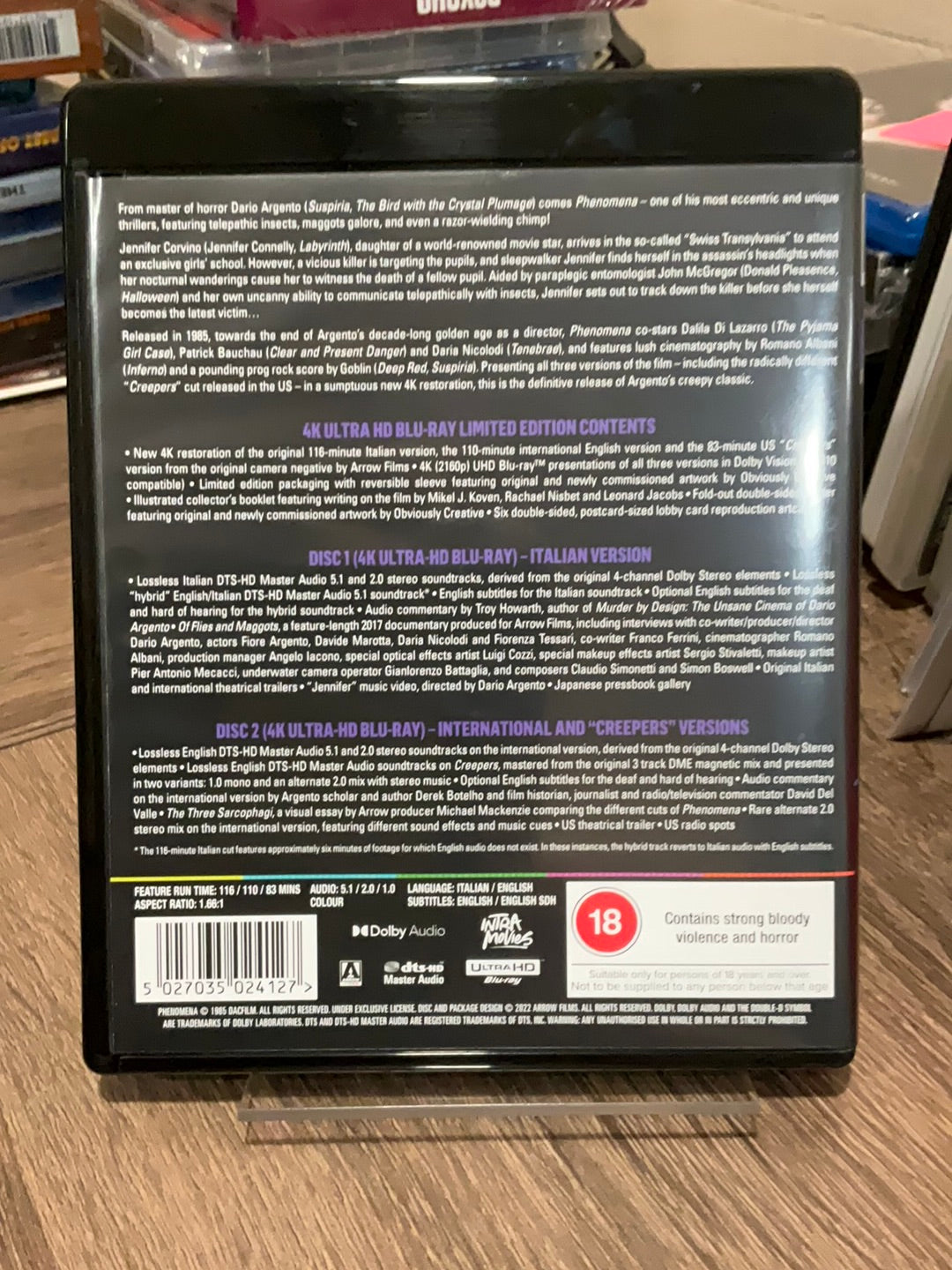 From master of horror Dario Argento (Suspiria, The Bird with the Crystal Plumage) comes Phenomena – one of his most eccentric and unique thrillers, featuring telepathic insects, maggots galore, and even a razor-wielding chimp! Jennifer Corvino (Jennifer Connelly, Labyrinth), daughter of a world-renowned movie star, arrives in the so-called “Swiss Transylvania” to attend an exclusive girls’ school. However, a vicious killer is targeting the pupils, and sleepwalker Jennifer finds herself in the assassin’s headlights when her nocturnal wanderings cause her to witness the death of a fellow pupil. Aided by paraplegic entomologist John McGregor (Donald Pleasence, Halloween) and her own uncanny ability to communicate telepathically with insects, Jennifer sets out to track down the killer before she herself becomes the latest victim… Released in 1985, towards the end of Argento’s decade-long golden age as a director, Phenomena co-stars Dalila Di Lazarro (The Pyjama Girl Case), Patrick Bauchau (Clear and Present Danger) and Daria Nicolodi (Tenebrae), and features lush cinematography by Romano Albani (Inferno) and a pounding prog rock score by Goblin (Deep Red, Suspiria). Presenting all three versions of the film – including the radically different “Creepers” cut released in the US – in a sumptuous new 4K restoration, this is the definitive release of Argento’s creepy classic. 4K ULTRA HD BLU-RAY LIMITED EDITION CONTENTS - New 4K restoration of the original 116-minute Italian version, the 110-minute international English version and the 83-minute US “Creepers” version from the original camera negative by Arrow films - 4K (2160p) UHD Blu-ray™ presentations of all three versions in Dolby Vision (HDR10 compatible) - Limited edition packaging with reversible sleeve featuring two original pieces of poster artwork - Illustrated collector’s booklet featuring writing on the film by Mikel J. Koven, Rachael Nisbet and Leonard Jacobs - Fold-out double-sided poster featuring two original pieces of artwork - Six double-sided, postcard-sized lobby card reproduction artcards DISC 1 (4K ULTRA-HD BLU-RAY) – ITALIAN VERSION - Lossless Italian DTS-HD Master Audio 5.1 and PCM 2.0 stereo soundtracks, derived from the original 4-channel Dolby Stereo elements - Lossless “hybrid” English/Italian DTS-HD Master Audio 5.1 soundtrack* - Audio commentary by Troy Howarth, author of Murder by Design: The Unsane Cinema of Dario Argento - Of Flies and Maggots, a feature-length 2017 documentary produced for Arrow Films, including interviews with co-writer/producer/director Dario Argento, actors Fiore Argento, Davide Marotta, Daria Nicolodi and Fiorenza Tessari, co-writer Franco Ferrini, cinematographer Romano Albani, production manager Angelo Iacono, special optical effects artist Luigi Cozzi, special makeup effects artist Sergio Stivaletti, makeup artist Pier Antonio Mecacci, underwater camera operator Gianlorenzo Battaglia, and composers Claudio Simonetti and Simon Boswell - Archival interview with Andi Sex Gang musician Simon Boswell DISC 2 (4K ULTRA-HD BLU-RAY) – INTERNATIONAL AND “CREEPERS” VERSIONS - Lossless English DTS-HD Master Audio 5.1 and PCM 2.0 stereo soundtracks on the international version, derived from the original 4-channel Dolby Stereo elements - Lossless English PCM 1.0 mono soundtrack on Creepers, mastered from the original 3 track DME magnetic mix - Audio commentary on the international version by Argento scholar and author Derek Botelho and film historian, journalist and radio/television commentator David Del Valle - The Three Sarcophagi, a visual essay by Arrow producer Michael Mackenzie comparing the different cuts of Phenomena * The 116-minute Italian cut features approximately six minutes of footage for which English audio does not exist. In these instances, the hybrid track reverts to Italian audio with English subtitles."