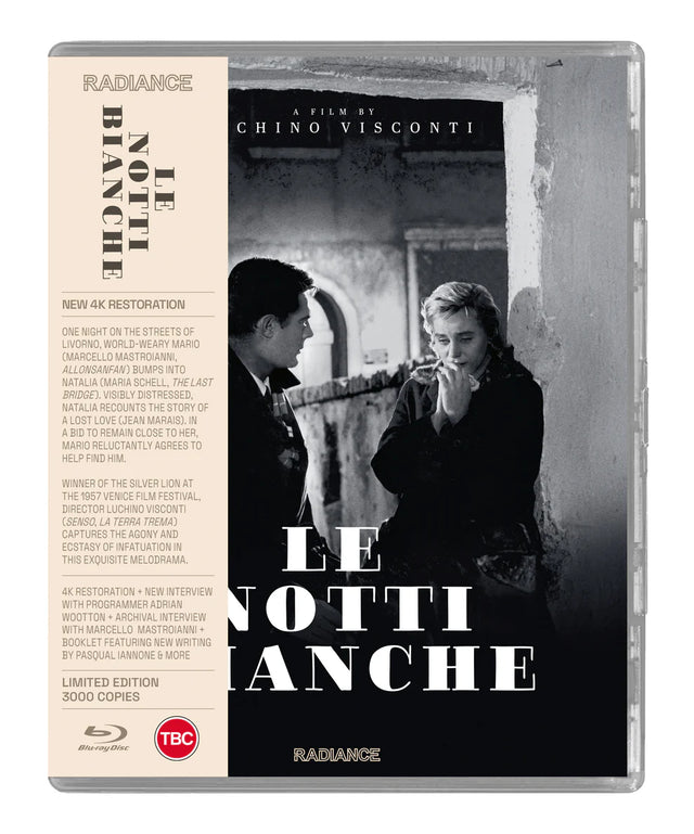 One fateful night on the streets of Livorno, world-weary Mario (Marcello Mastroianni, Allonsanfan) bumps into Natalia (Maria Schell, The Last Bridge), a visibly distressed young woman. As Marco attempts to comfort her, Natalia recounts the story of a lost love (Jean Marais) who she hears is back in town. In a bid to remain close to her, Mario reluctantly agrees to help Maria find him. Adapted from a Fyodor Dostoyevsky short story, director Luchino Visconti (Senso, La terra trema) captures the agony and ecstasy of infatuation in this exquisite melodrama. Headlined by two stellar performances from Marcello Mastroianni and Maria Schell, Le notti bianche won the Silver Lion at the 1957 Venice Film Festival.