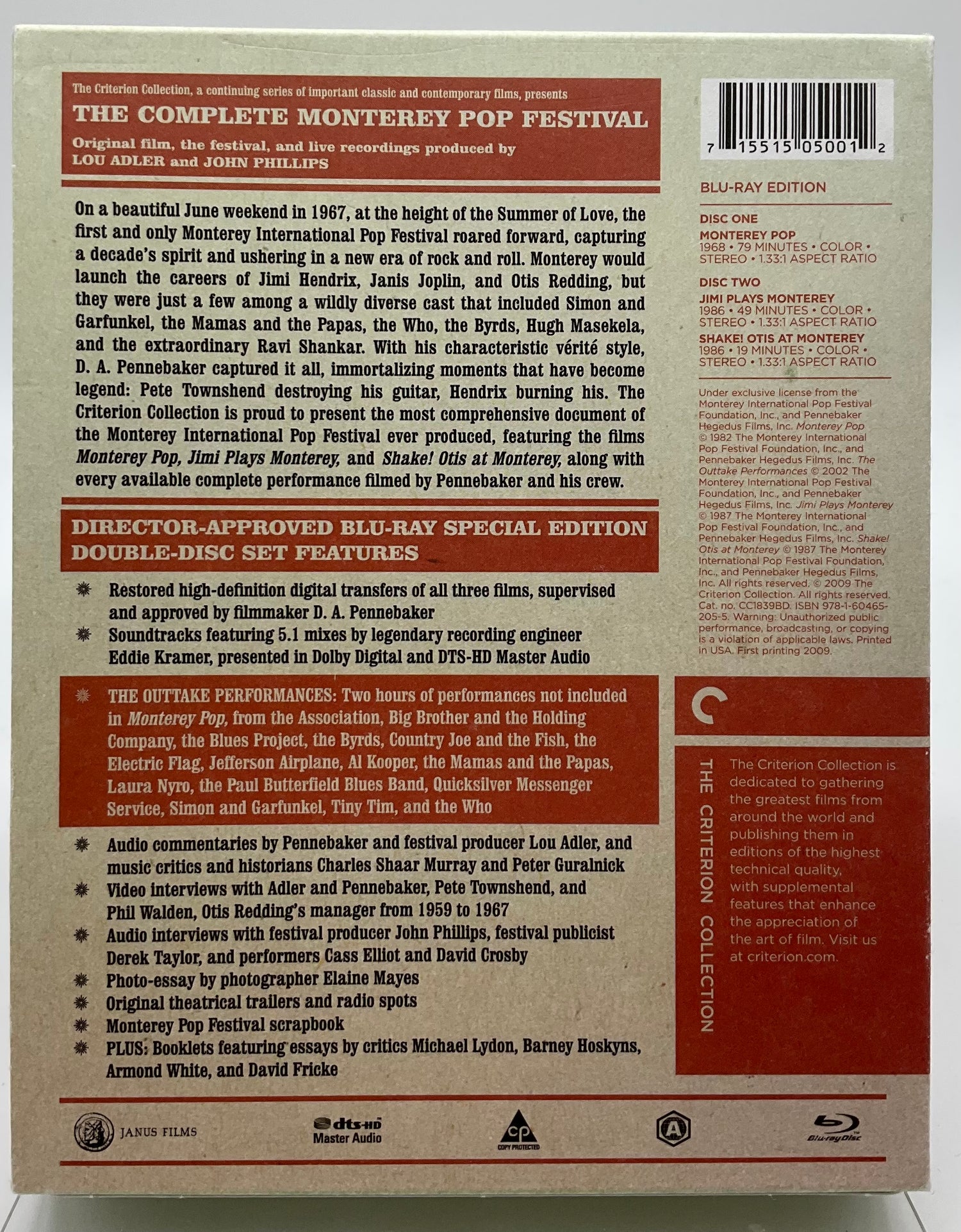 On a beautiful weekend in 1967 at the height of the so called "summer of love," the first and only Monterey International Pop Festival raored forward - capturing a decade's spirit and ushering in a new era of rock and roll. Monterey would launch the careers of Jimi Hendrix, Janis Joplin, and Otis Redding, but they were just a few among a wildly diverse lineup including Simon & Garfunkel, The Mamas and the Papas, The Who, The Byrds, Hugh Masekela, and the extraordinary Ravi Shankar. The Criterion Collection is proud to present the most comprehensive document of The Monterey International Pop Festival ever produced, featuring all three films of the festival: "Monterey Pop," "Jimi Plays Monterey and Shake! Otis At Monterey" along with "Monterey Pop: The Outtake Performances.
