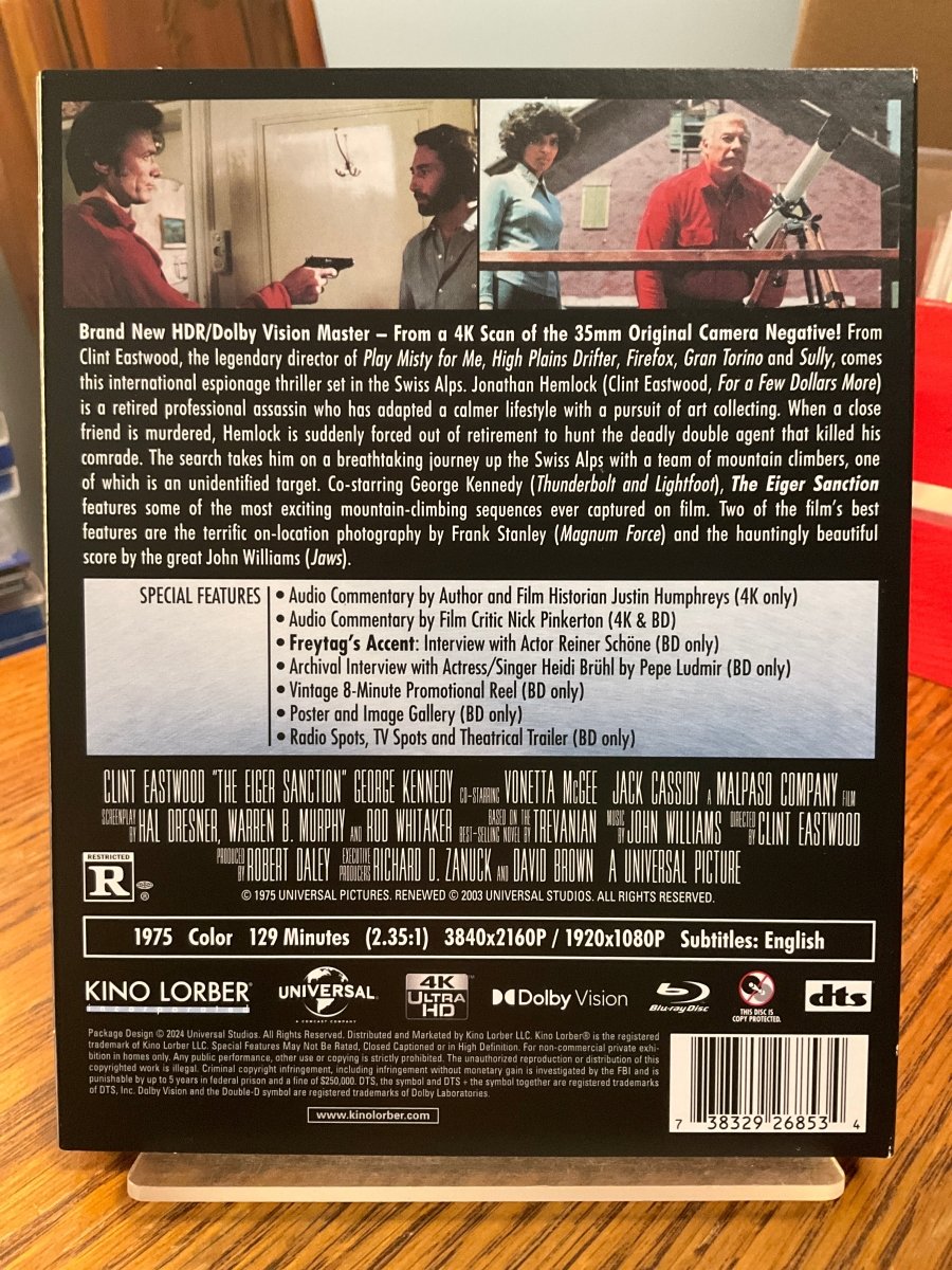 From Clint Eastwood, the legendary director of Play Misty for Me, High Plains Drifter, Firefox, Gran Torino and Sully, comes this international espionage thriller set in the Swiss Alps. Jonathan Hemlock (Clint Eastwood, For a Few Dollars More) is a retired professional assassin who has adapted a calmer lifestyle with a pursuit of art collecting. When a close friend is murdered, Hemlock is suddenly forced out of retirement to hunt the deadly double agent that killed his comrade. The search takes him on a breathtaking journey up the Swiss Alps with a team of mountain climbers, one of which is an unidentified. target. Co-starring George Kennedy (Thunderbolt and Lightfoot), The Eiger Sanction features some of the most exciting mountain-climbing sequences ever captured on film. Two of the film’s best features are the terrific on-location photography by Frank Stanley (Magnum Force) and the hauntingly beautiful score by the great John Williams (Jaws).